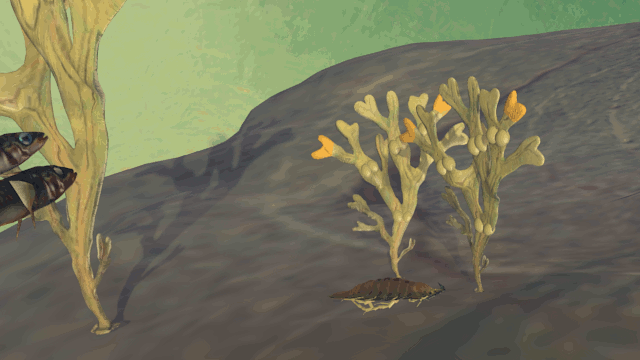 Matalan merenlahden kasvi- ja levälajisto luo hyvän elinympäristön monille eläinlajeille (piirros M. Dernjatin 2000, pikkukuvat A. Hemmi ym.).